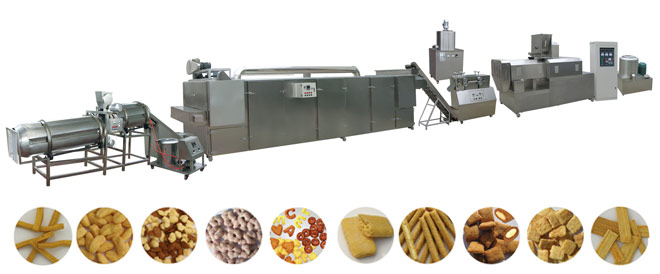 設(shè)備配置:拌粉機→上料機→雙螺桿擠壓機機→夾心機→整形切斷機→輸送機→多層烤箱