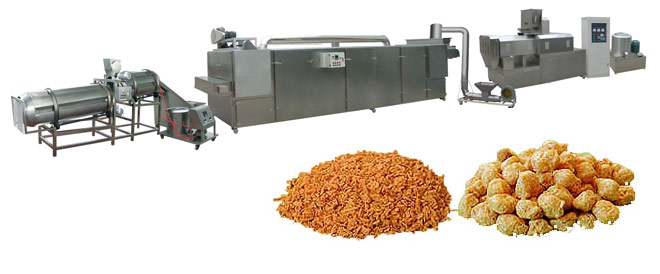 (3)拆絲:將脫水后的拉絲蛋白打散拆絲。把復(fù)水脫水后的拉絲蛋白置于快速打漿機(jī)中(鈍刀,轉(zhuǎn)速約500~1000rpm),打漿約2~3分鐘即可。也可用轉(zhuǎn)速達(dá)300rpm以上的擂潰機(jī)、攪拌機(jī)拆絲?;蛘邔匕铏C(jī)反轉(zhuǎn)(刀背)運(yùn)行1分鐘左右(切刀速度約500~1000rpm)。 拉絲蛋白產(chǎn)品具有極佳的結(jié)構(gòu)和真實(shí)肉質(zhì)纖維的組織,非常適合用于各類高級(jí)素食仿肉食品的加工,如素火腿、素雞、素魚、素漢堡、素?zé)峁?、素茶鵝、素牛排、素肉松等。產(chǎn)品本身亦具有良好的吸水性、保油性,經(jīng)過(guò)適當(dāng)?shù)募庸ぜ夹g(shù)后,是一種理想的高蛋白肉制品添加物,在肉制品應(yīng)用中,可達(dá)到增強(qiáng)肉感,降低成本,提高產(chǎn)品中的蛋白質(zhì)含量的目的。如應(yīng)用于肉糜腸類、西式火腿、肉丸類、重組排類(雞排、豬排等)、油炸雞塊、漢堡肉類餃子、包子、肉粽等速凍肉制品中;用于諸如仿肉牛肉干,重組牛肉粒,葷素肉松等休閑食品也是絕佳的選擇。拉絲蛋白產(chǎn)品復(fù)水即可調(diào)理制作菜肴或代替部分肉品使用,因此可直接供食堂、配餐公司、餐廳等選購(gòu)。本品不僅操作方便,也倡導(dǎo)了健康營(yíng)養(yǎng)的飲食新概念,同時(shí)可達(dá)到降低成本的效果(不到瘦肉成本的1/2),為一新潮流趨勢(shì)的食材選擇。