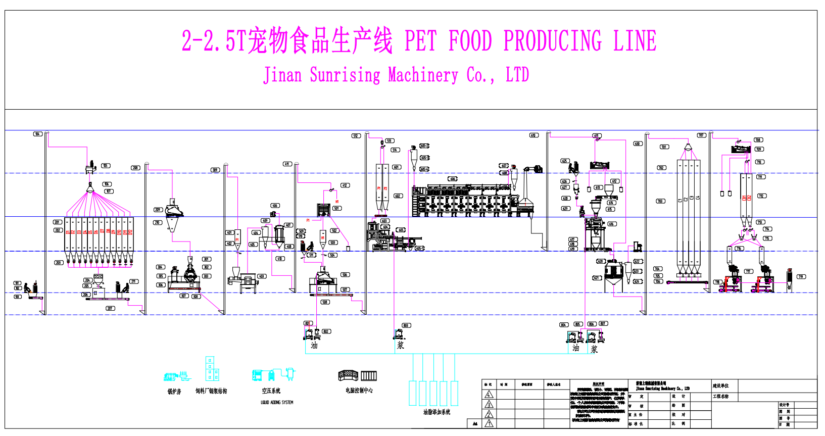 本套2-2.5T/h寵物食品生產(chǎn)線工藝特點(diǎn),因客戶是空地建設(shè),我司設(shè)計(jì)首先考慮工藝流程的順暢,在設(shè)計(jì)上人性化布局,采用4層鋼結(jié)構(gòu)設(shè)計(jì),車間建設(shè)高度19米(因客戶政府高度限制),工藝方面使用國內(nèi)主流二次混合,二次粉碎、雙螺桿膨化機(jī)、真空噴涂、逆流冷卻,產(chǎn)品混色,包裝碼垛等全部自動(dòng)流水線。配料倉采用12倉,滿足多種配方配料要求,配料軟件采用布勒系統(tǒng)。配料穩(wěn)定,可儲(chǔ)存多種配方,配料記錄可留檔查詢,原料混合使用雙軸漿葉混合機(jī),混合均勻度≥98%,雙軸混合機(jī)排料殘留低,可保證每批原料的混合均勻度一致,粉碎機(jī)工藝采用粗粉加細(xì)粉,批次粉碎。避免不同原料進(jìn)粉碎機(jī)因過篩問題產(chǎn)生沉降層。粗粉碎使用臥室錘片粉碎機(jī),粉碎細(xì)度20目,產(chǎn)量高。細(xì)粉使用超威粉碎機(jī),刀頭使用鎢合碳化鋼,硬度高。粉碎細(xì)度80目過篩率95%。保證產(chǎn)品成型表面光滑,無凹凸顆粒狀。在二次混合添加微量元素和一定比例油脂,提高產(chǎn)品油脂含量。膨化機(jī)使用雙螺桿膨化機(jī),產(chǎn)品穩(wěn)定,烘干使用帶式低溫干燥,微量元素?zé)釗p低,噴涂使用真空噴涂,油脂添加30%。使用翻板逆流冷卻器,冷卻效果好,配置4倉暫存?zhèn)},可以存儲(chǔ)4種不同顏色的產(chǎn)品,每個(gè)倉存儲(chǔ)可以到6個(gè)小時(shí)膨化產(chǎn)能的產(chǎn)品??梢酝瑫r(shí)四個(gè)顏色進(jìn)行混合,包裝方面配置自動(dòng)打包稱,自動(dòng)碼垛機(jī),給帶式包裝機(jī),包裝規(guī)格500g-25kg全部實(shí)現(xiàn)。