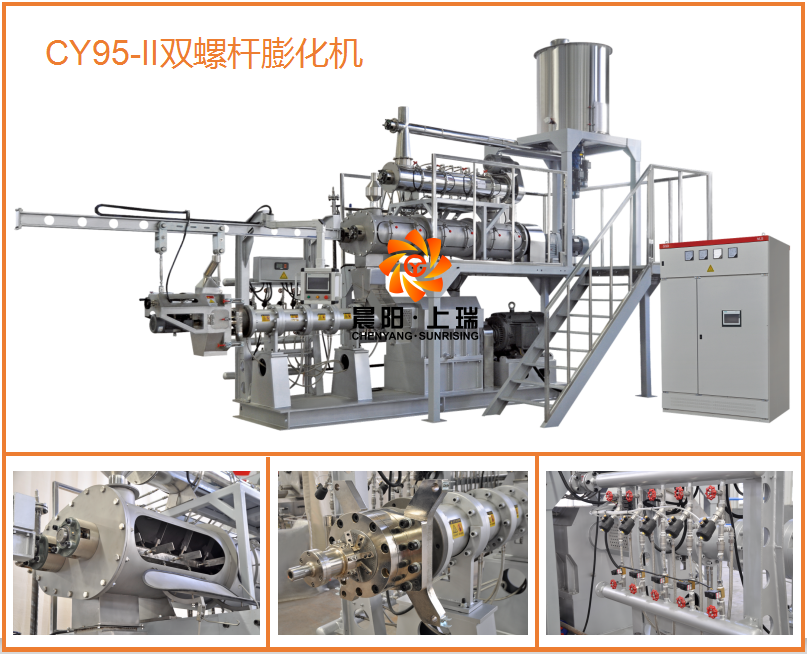 晨陽CY95-II雙螺桿膨化機(jī),主電機(jī)搭載110kw,變頻調(diào)速。變速箱使用NSK軸承,南京原裝箱體。使用壽命長,機(jī)筒使用45鋼圓形機(jī)筒內(nèi)鑲嵌合金襯套,文丘里使用38CrmoaL,螺桿長徑比19.5.整體使用積木組合螺桿,雙頭螺紋,材質(zhì)38CrmoaL。產(chǎn)能2.5T/h,磨損壽命達(dá)2萬噸以上,機(jī)器良好的齒輪箱和機(jī)筒螺桿組合可以保證24小時(shí)不停機(jī)生產(chǎn)。膨化機(jī)喂料方式采用圓盤是破拱喂料器,喂料均勻穩(wěn)定,調(diào)制器使用單軸調(diào)制器加雙軸差速調(diào)制器,調(diào)制效果好,熟化度高,調(diào)制器特別配置鮮肉添加功能,實(shí)現(xiàn)鮮肉狗糧生產(chǎn)功能。膨化機(jī)使用PLC自動(dòng)控制,控制機(jī)筒溫度和其它電機(jī)參數(shù)。調(diào)制器蒸汽、水添加分手動(dòng)控制和自動(dòng)控制,自動(dòng)控制添加可以通過比例調(diào)節(jié)閥實(shí)現(xiàn)參數(shù)自由設(shè)定化,達(dá)到和5-10噸膨化機(jī)臺(tái)異曲同工之處。