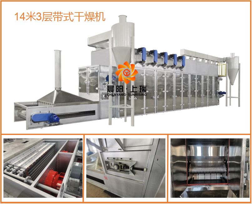干燥方面,客戶技術(shù)指標(biāo),成品大于2H/h,脫水率:32%降至5%以內(nèi),對脫水干燥能力具有較高的要求, 晨陽干燥機(jī)本次配置14米3層干燥機(jī),帶寬2米,箱室高度達(dá)2.4米,通風(fēng)對流效果好,中間段12米,2米一節(jié)。使用不銹鋼鏈板網(wǎng)帶,使用壽命長,鏈板基本上沒有維修率,鏈板沖孔方式使用晨陽設(shè)計(jì)的新技術(shù),透風(fēng)性好,支撐能力強(qiáng),托料能力強(qiáng)。一平方承載22.5-35公斤物料。3層鏈板獨(dú)立變頻調(diào)速,烘干停留時(shí)間30-90分鐘。2段控溫,自動(dòng)比例調(diào)節(jié)閥。蒸汽加熱,使用碳鋼無縫管鋁翅片,散熱好,能源利用高,獨(dú)立變頻的排濕系統(tǒng),濕度數(shù)顯,數(shù)據(jù)化操作。出料端設(shè)計(jì)3米強(qiáng)制冷卻段,迅速降低顆粒表面溫度。確保在后端噴涂前工藝緩沖倉不會(huì)因溫度過高產(chǎn)生熱汽結(jié)團(tuán)