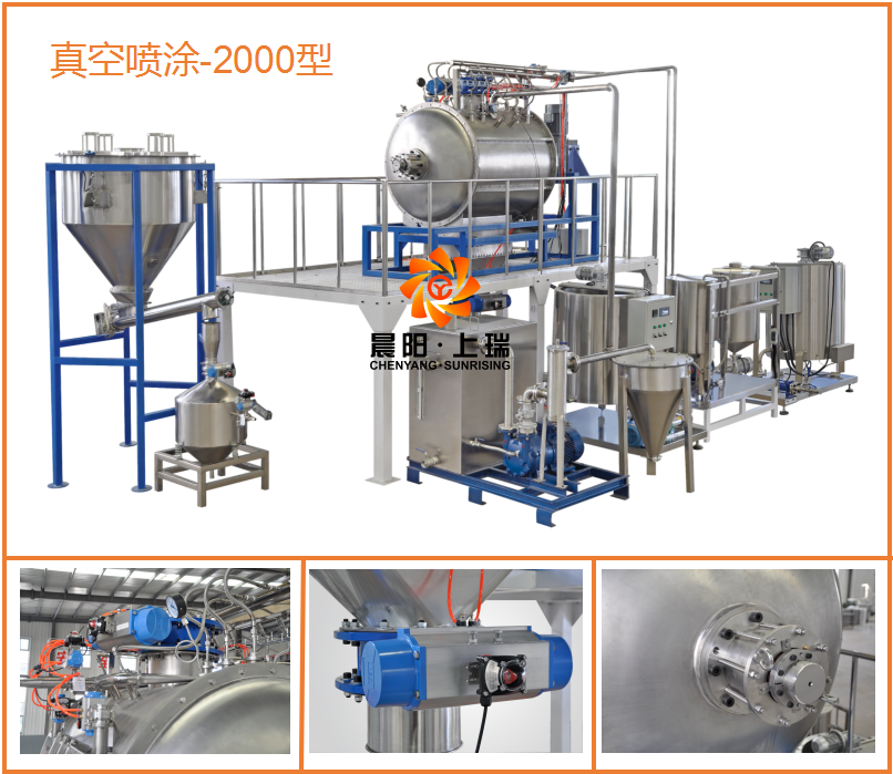 真空噴涂使用晨陽自行研發(fā)的第三代真空噴涂機(jī),該真空噴涂系統(tǒng)目前使用臥式單軸漿葉混合機(jī),該機(jī)比較適合2噸生產(chǎn)線的產(chǎn)品配置使用,具有高性價(jià)比的使用效果。密封閥門使用進(jìn)口配置,機(jī)械密封使用合資配置,減速機(jī)使用硬齒面減速機(jī),食品接觸完全304材質(zhì)。真空狀態(tài)下噴涂油脂含量可以到30%,真空壓力達(dá)0.095mpa,動(dòng)態(tài)狀態(tài)下保壓0.09mpa堅(jiān)持10分鐘在以上。配置水冷真空泵。油脂,風(fēng)味劑都是在真空狀態(tài)下完成,油脂獨(dú)立稱重系統(tǒng),膏狀風(fēng)味劑,獨(dú)立稱重系統(tǒng),不同液態(tài)使用不同的輸送泵,晨陽公司自行編輯的運(yùn)行軟件在第三代真空噴涂已經(jīng)實(shí)現(xiàn)完全自動(dòng)化,穩(wěn)定化,參數(shù)可視化,重要部位數(shù)據(jù)監(jiān)視報(bào)警,數(shù)據(jù)存儲(chǔ),配方留檔等強(qiáng)大功能。