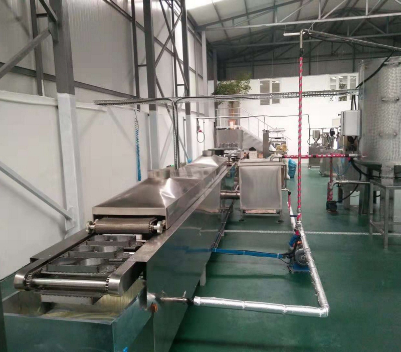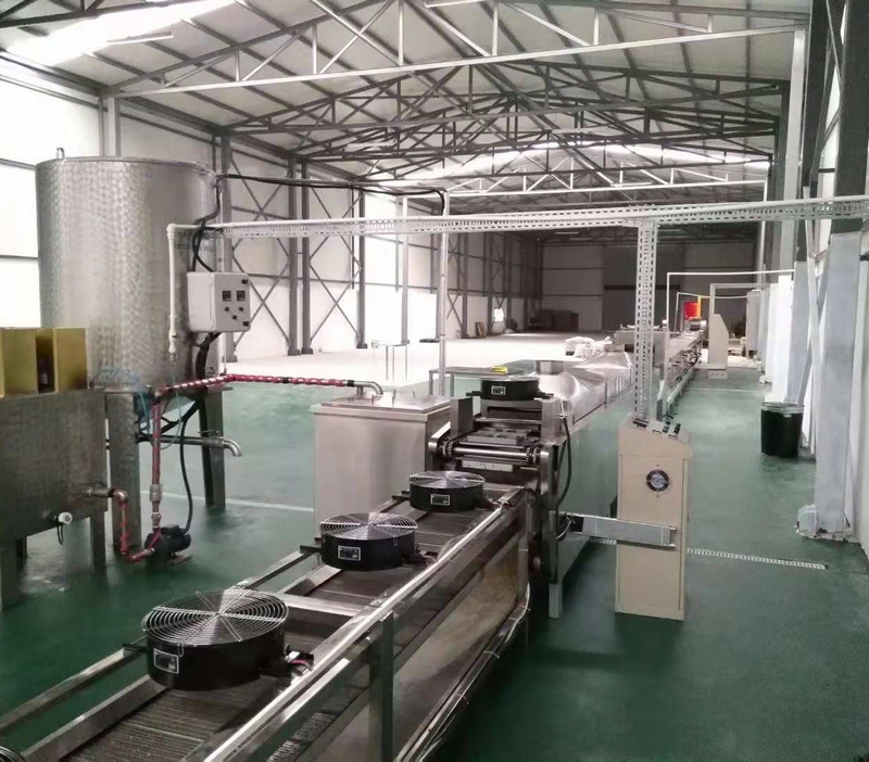 和面機→壓面機→蒸煮切斷機→油炸機→冷卻機