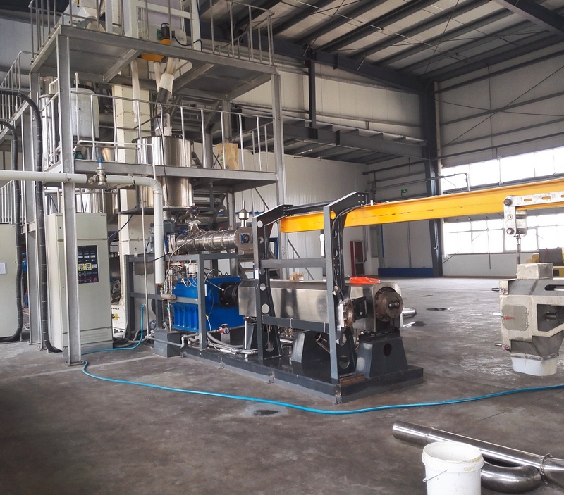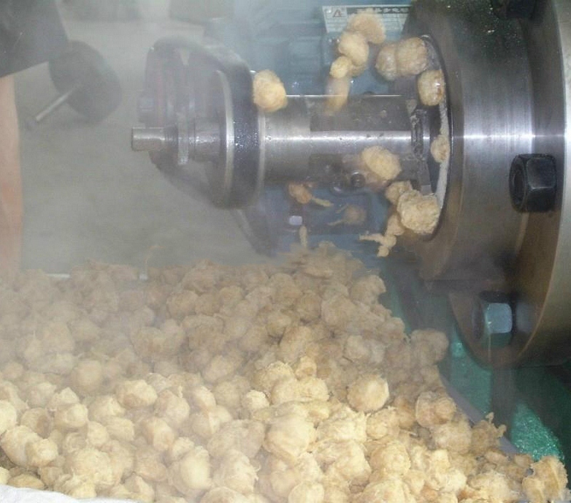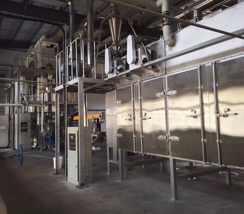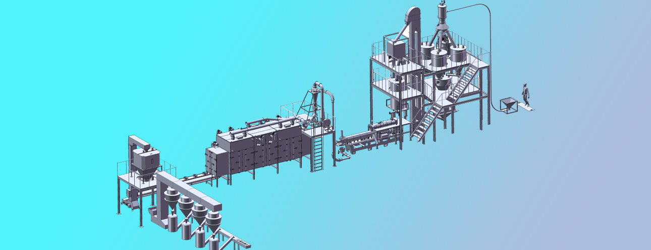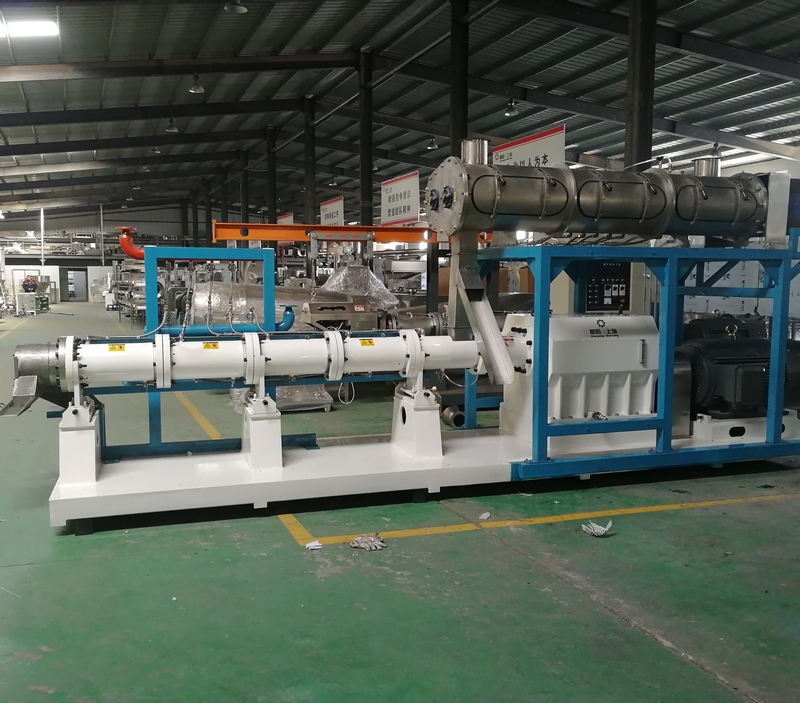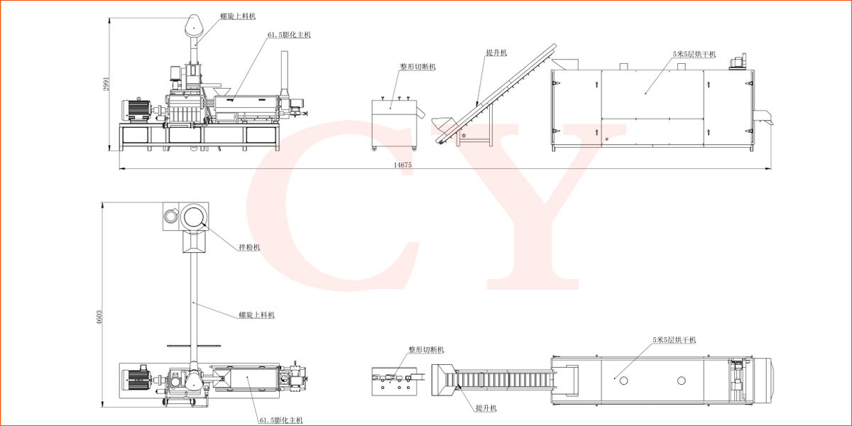 拌粉機(jī)→螺旋上料機(jī)→雙螺桿膨化機(jī)→切斷機(jī)→提升機(jī)→烘干機(jī)