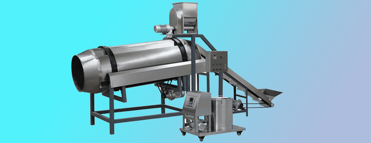單滾筒調(diào)味設(shè)備主要用于休閑膨化食品、寵物食品的表面噴油與調(diào)味,具有產(chǎn)量高,可連續(xù)作業(yè)等特點。滾筒前端先噴油,物料表面有粘性后 在滾筒中端再撒入調(diào)味粉,調(diào)味粉可以更好的黏附在產(chǎn)品表面。