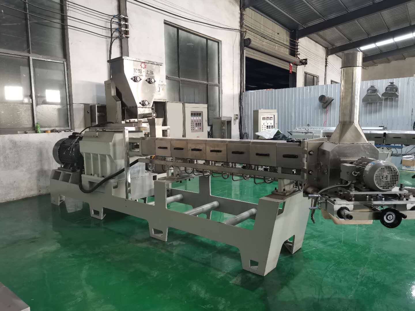 雙螺桿膨化機(jī)由供料系統(tǒng)、擠壓系統(tǒng)、旋切系統(tǒng)、加熱系統(tǒng)、冷卻系統(tǒng)、傳動系統(tǒng)、控制系統(tǒng)組成。該機(jī)適用原料廣泛、生產(chǎn)產(chǎn)品多樣,變頻調(diào)速、自動化程度高、運行平穩(wěn)、使用壽命長。